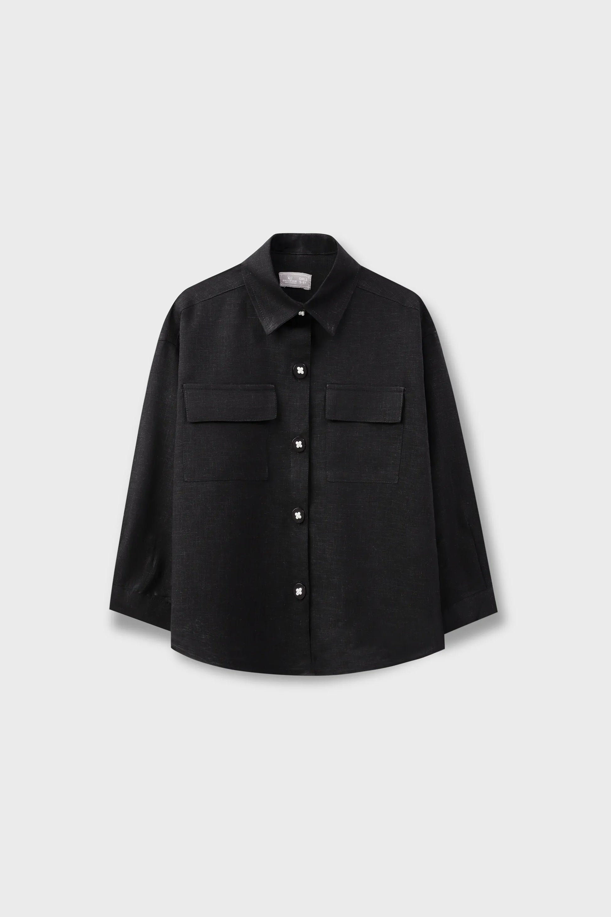 Elevate her everyday style with this sleek black cotton shirt featuring delicate pearl-detailed buttons for a subtle glam touch. The flap chest pockets and slightly curved hem add utility-inspired structure, while the collared neckline and buttoned cuffs keep it crisp. A timeless piece for girls who love fashion with edge.