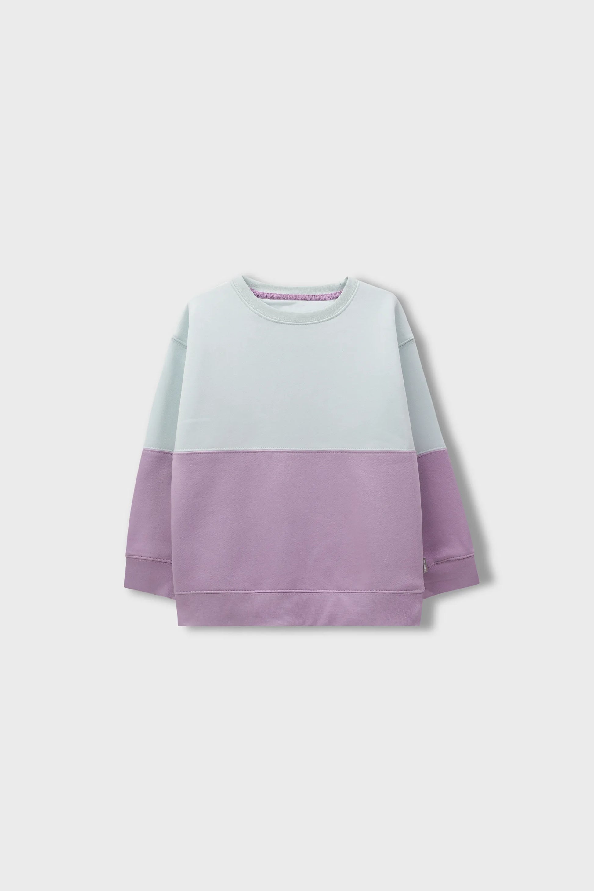 A perfect blend of comfort and charm, this fleece sweatshirt features a soft ice blue upper and lilac lower panel. The relaxed crew neck and trendy high-low hem give it a playful silhouette, making it an easy choice for cozy days, school outings, or weekend fun.