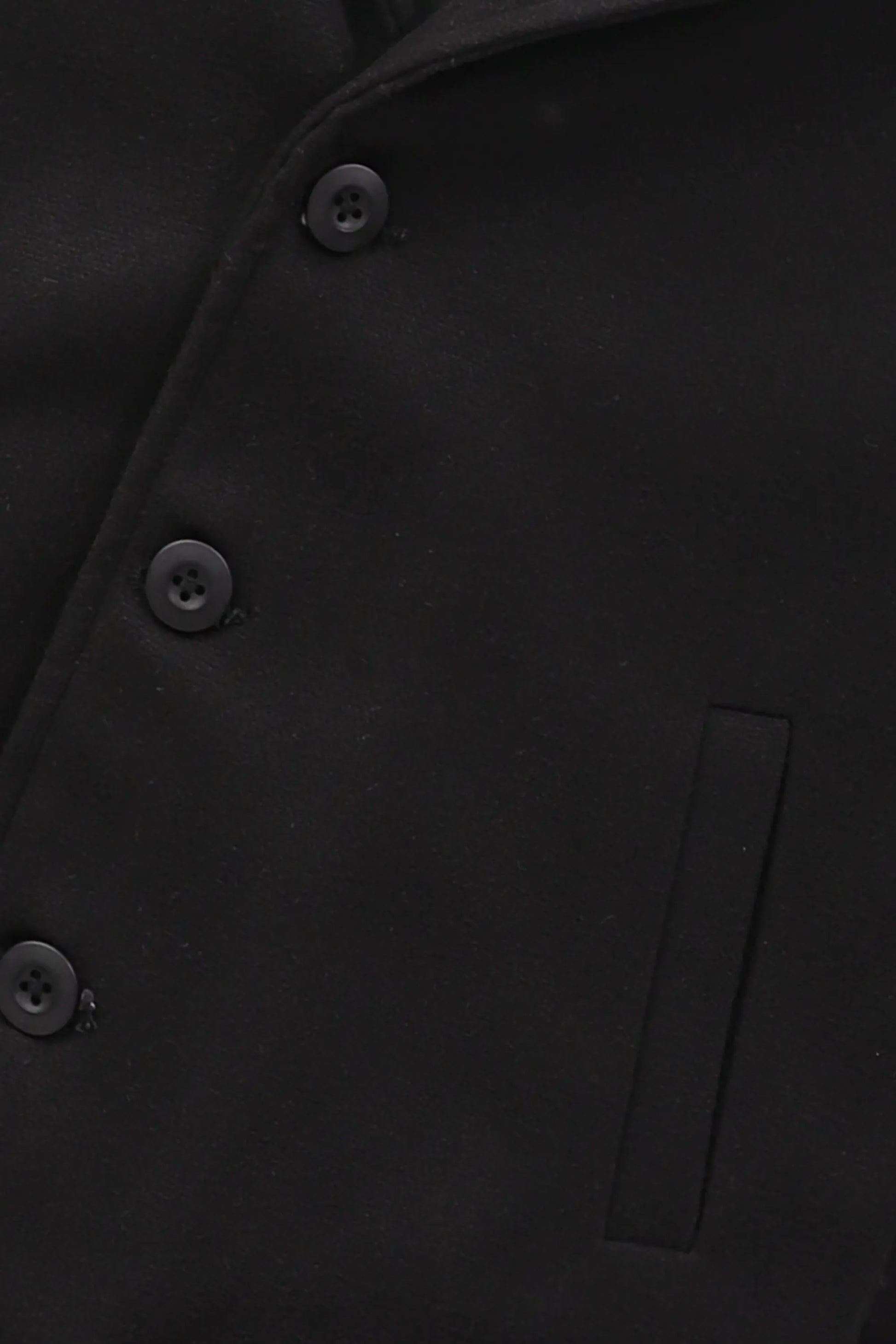 Sophisticated yet bold, this black felt coat brings timeless style to chilly days. Featuring a sharp double-press lapel, three-button closure, and double bone pockets with detailed champa stitching, it’s a nod to classic tailoring. Designed for warmth and flair, it adds effortless polish to every winter outing.