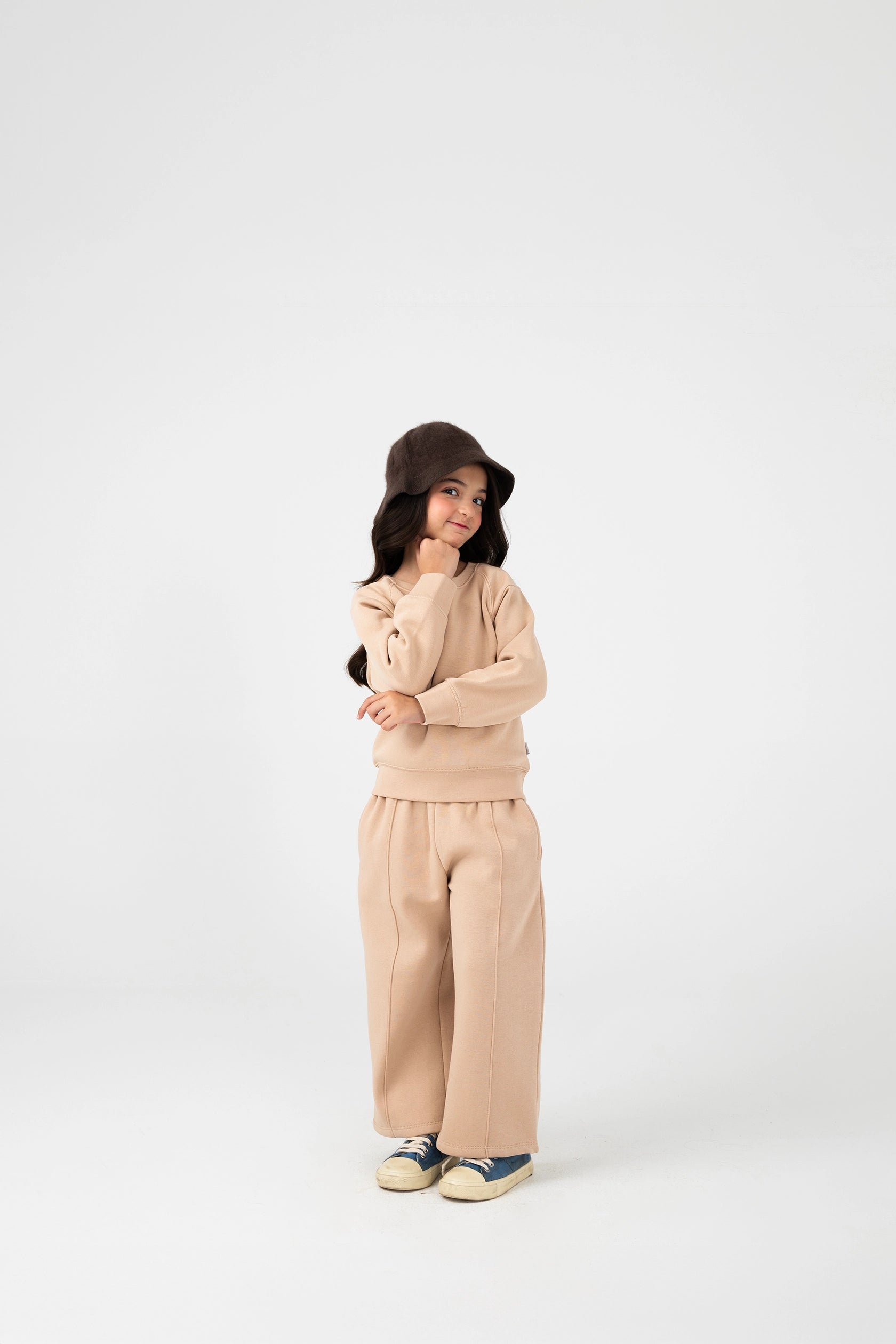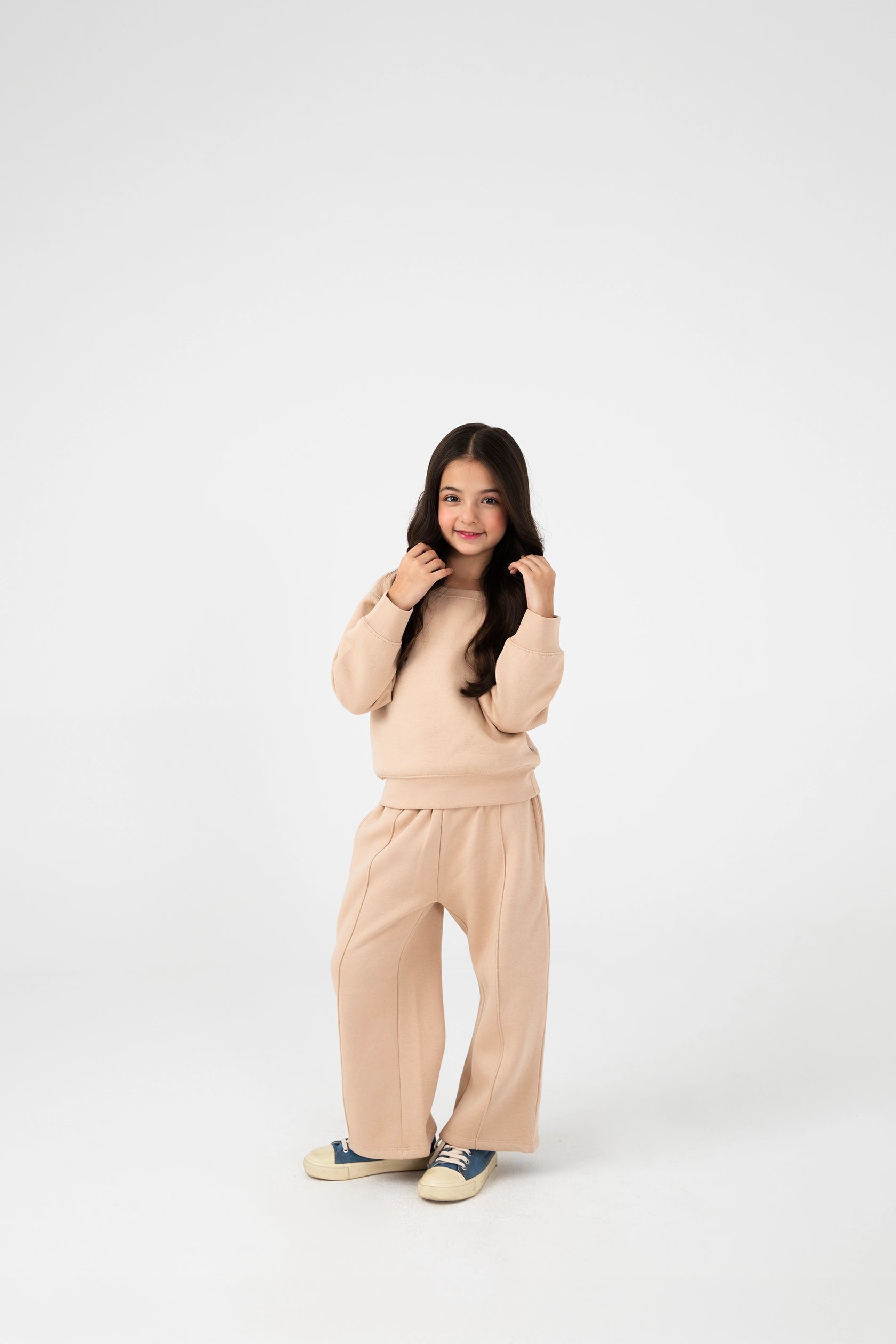 A chic fleece co-ord set in soft beige, designed for warmth and everyday style. The cropped raglan sweatshirt showcases ripple-cut seams and an elegant “R” embroidery, while the wide trousers offer a relaxed silhouette. Ideal for school days, playdates, or lounging in cozy comfort.