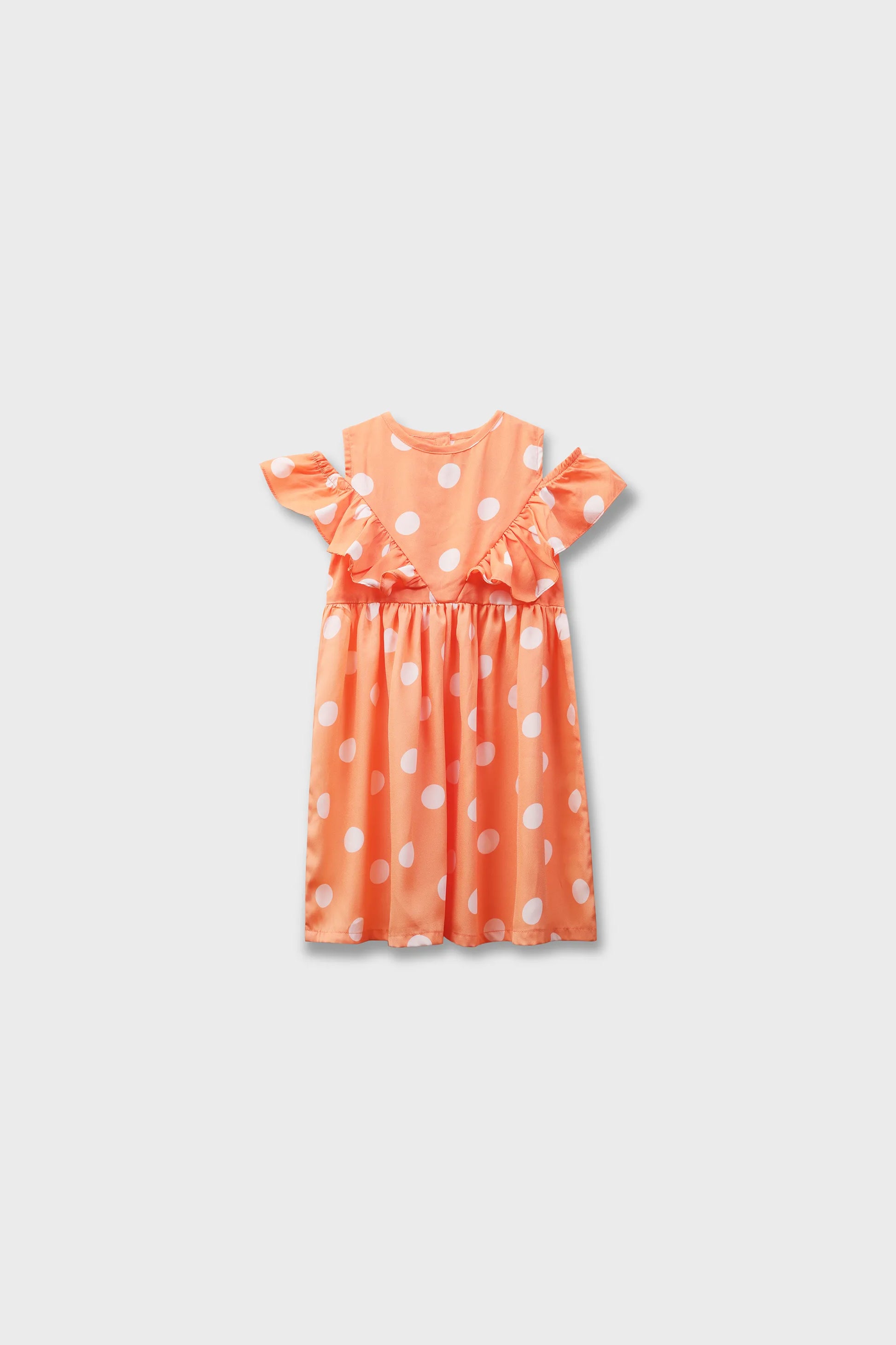 Bright and playful, this orange off-shoulder dress is crafted from smooth shamooz fabric featuring white polka dots. The flutter sleeves and flared hemline add a charming touch, while the soft sheen of the fabric makes it perfect for parties, festive occasions, or summer outings.