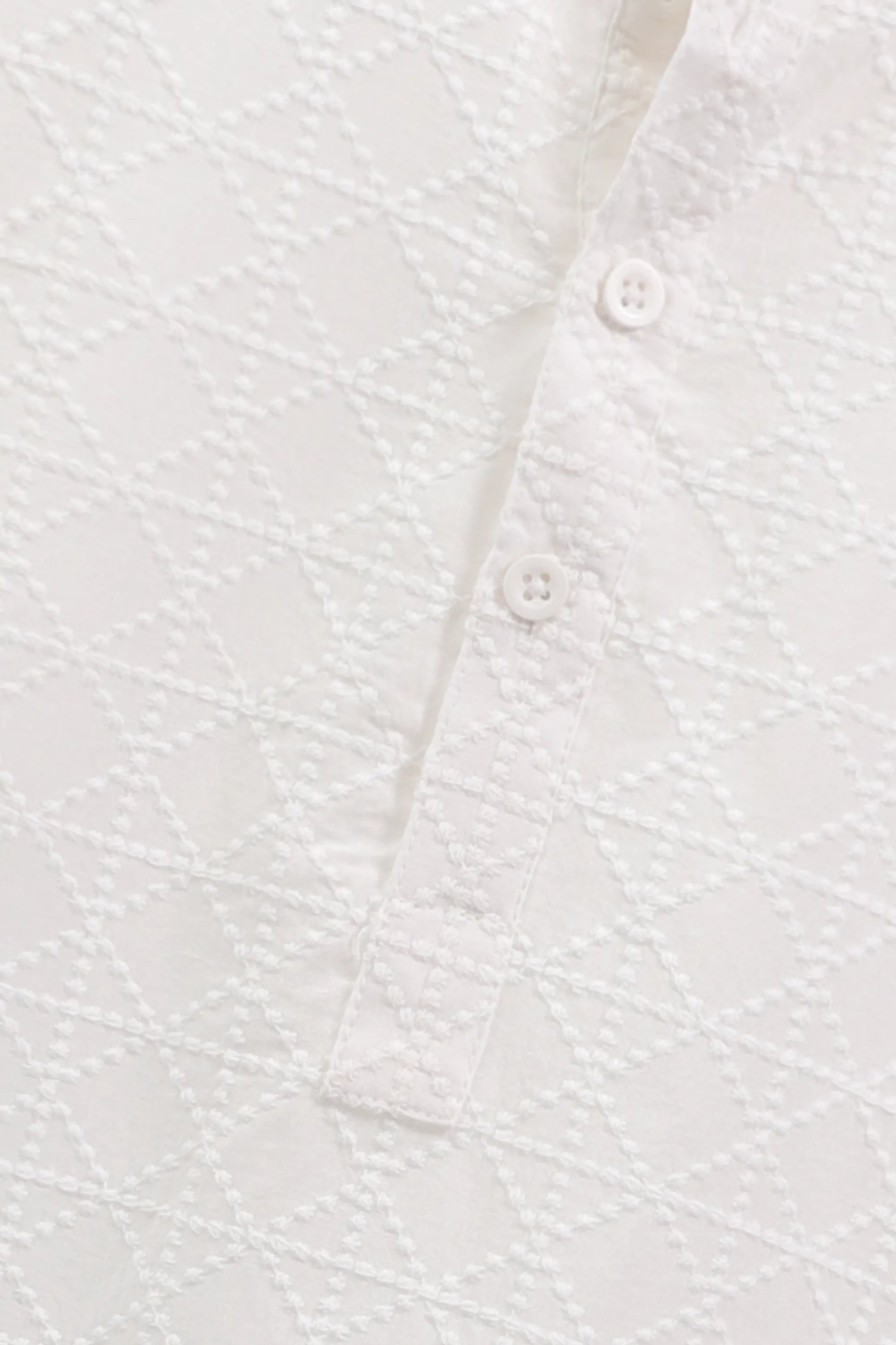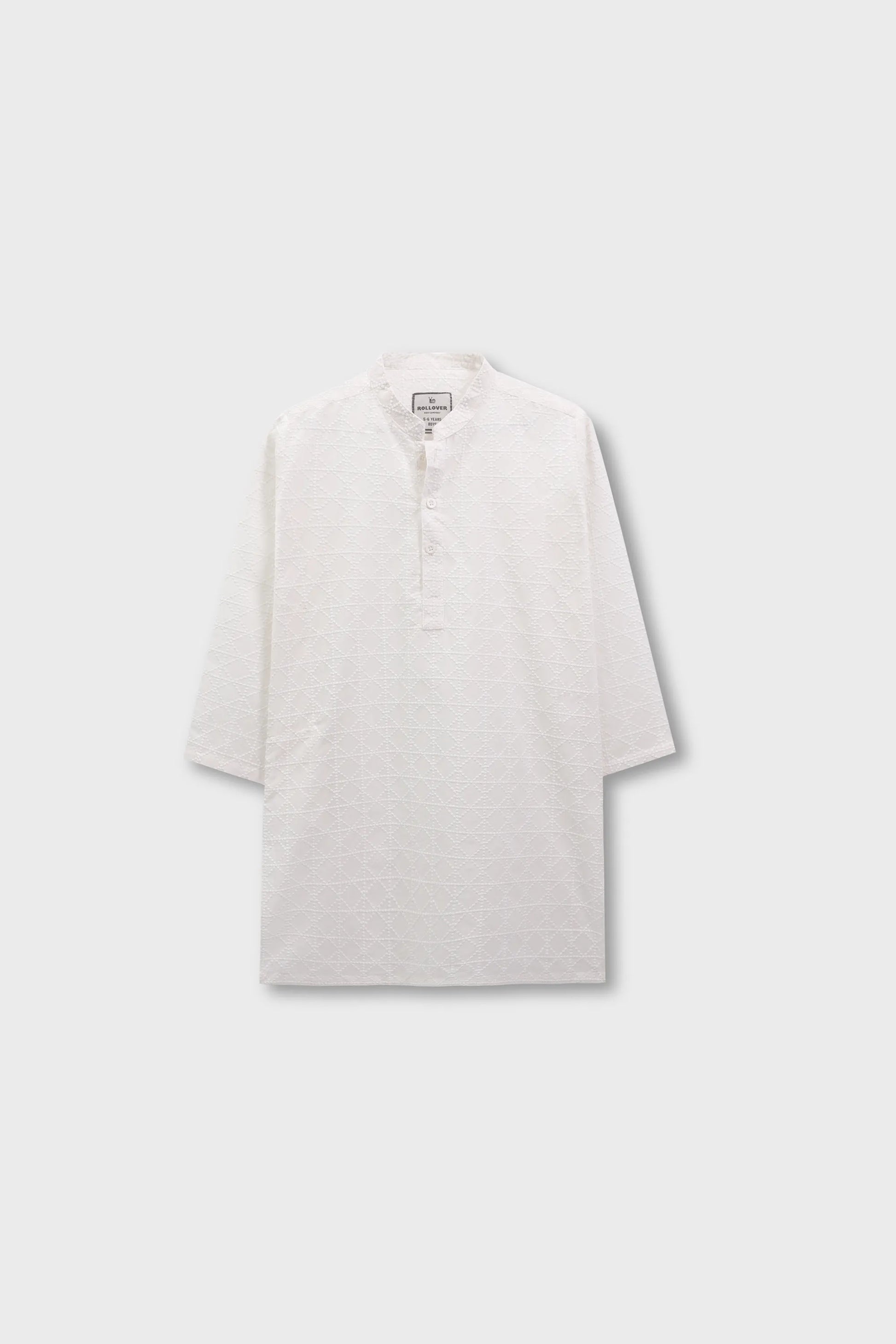 Designed in breathable cotton jacquard, this white kurta provides a refined traditional look with modern comfort. It features a woven textured pattern, band collar, and front placket for easy wear. Ideal for cultural events, festive days, and formal gatherings, it ensures style and ease throughout the day.
