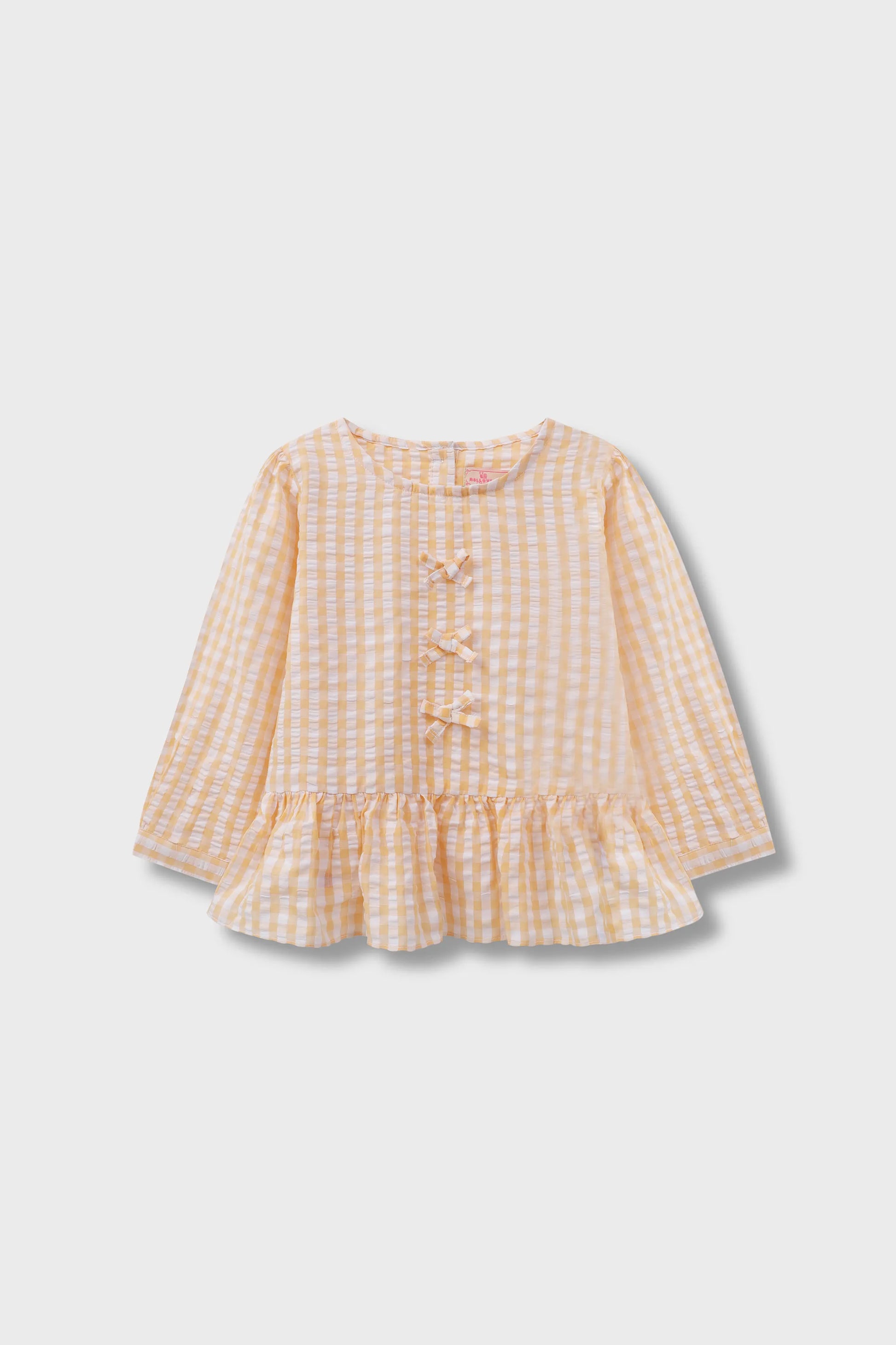 This adorable girls’ top is crafted from soft, breathable cotton with a charming yellow and white check pattern. It features long sleeves, buttoned cuffs, delicate front bow detailing, and a flared peplum hem for a playful look. Perfect for everyday wear, outings, and seasonal styling.