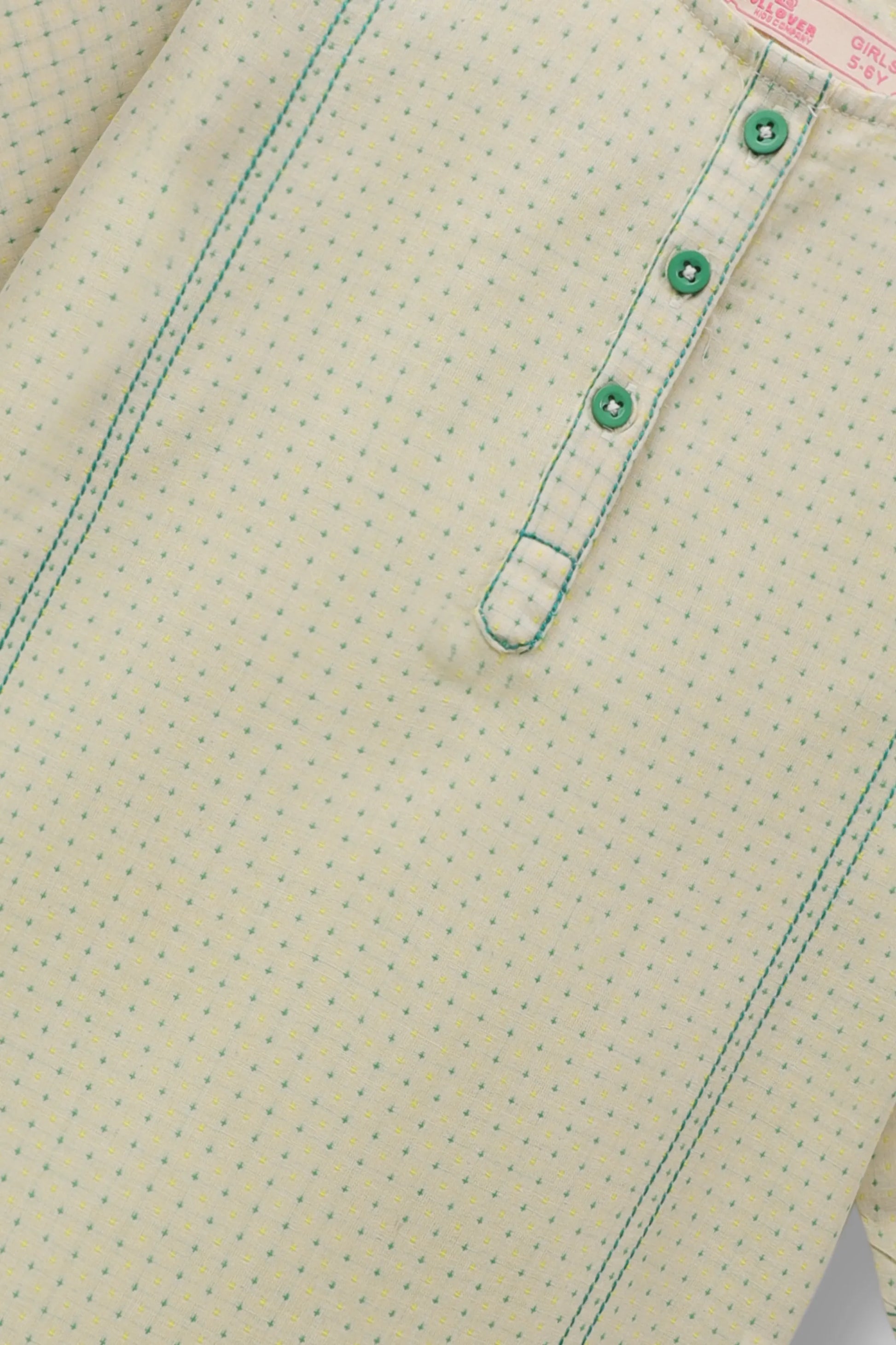 Made from premium cotton, this kurti-style beige top features delicate dotted prints and green vertical detailing for a refined finish. The relaxed fit, straight hem, and easy slip-on neckline provide comfort and charm. Ideal for summer days, gatherings, or pairing with jeans, leggings, or shorts.