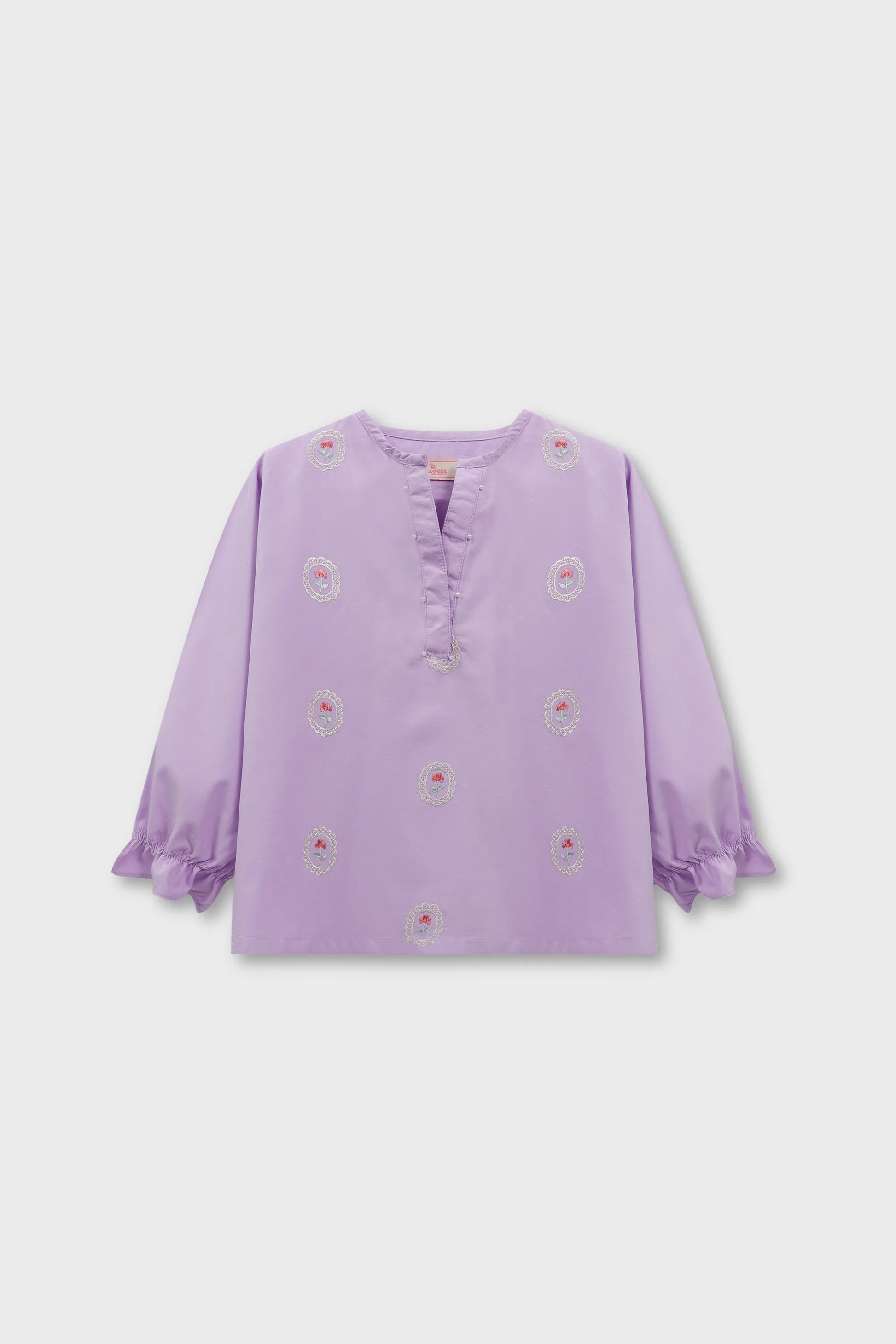 This charming lilac top is crafted from soft cotton and adorned with floral embroidery, creating a lovely garden-inspired look. The relaxed fit and elasticized cuffs add comfort, while the elegant design is perfect for both casual playdates and special occasions.