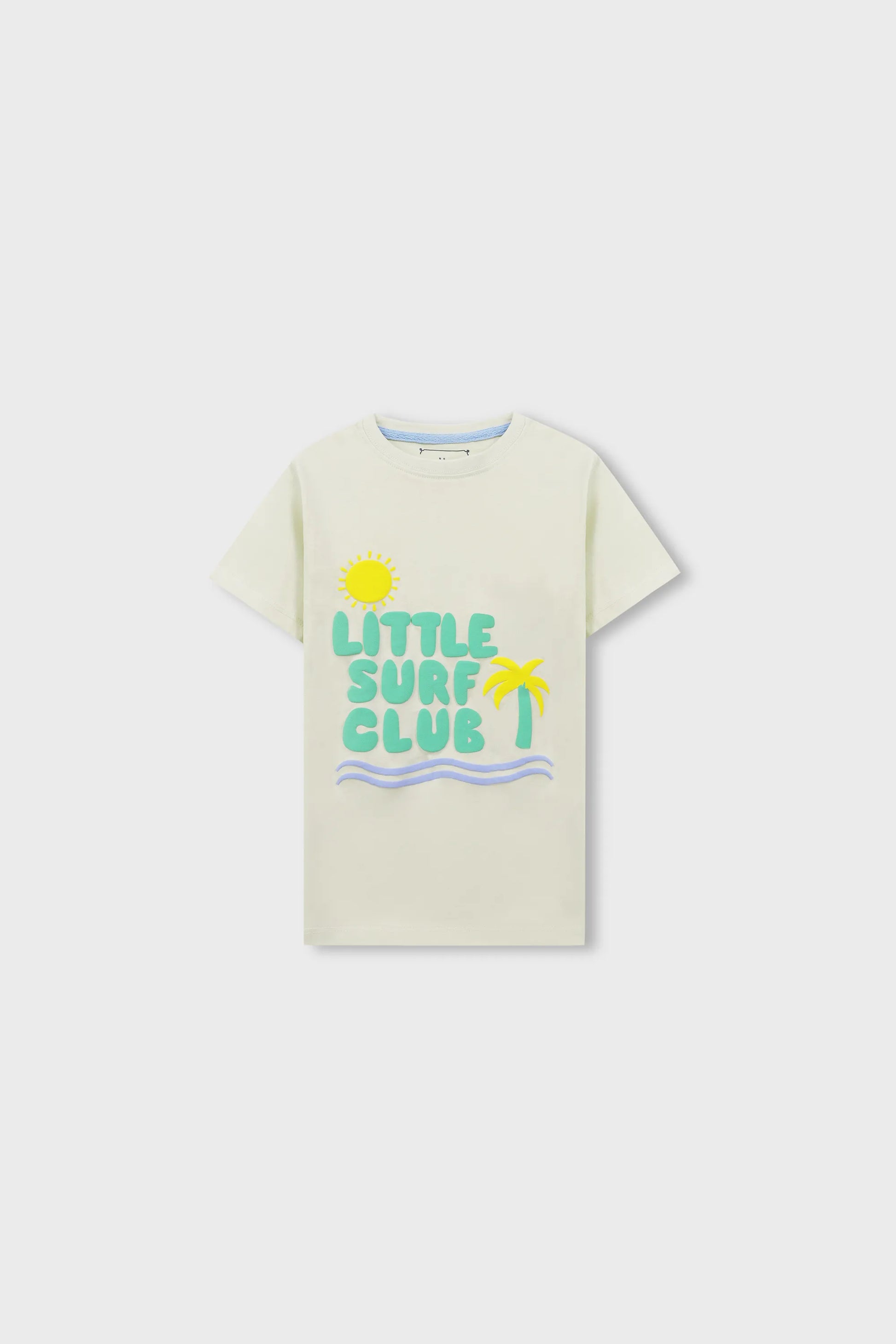 Crafted from soft jersey fabric, this pistachio boys t shirt features a playful surf inspired graphic with sunshine, waves, and palm motifs. Designed with a classic crew neck and short sleeves, it offers breathable comfort, smooth stitching, and an easy regular fit for everyday adventures.