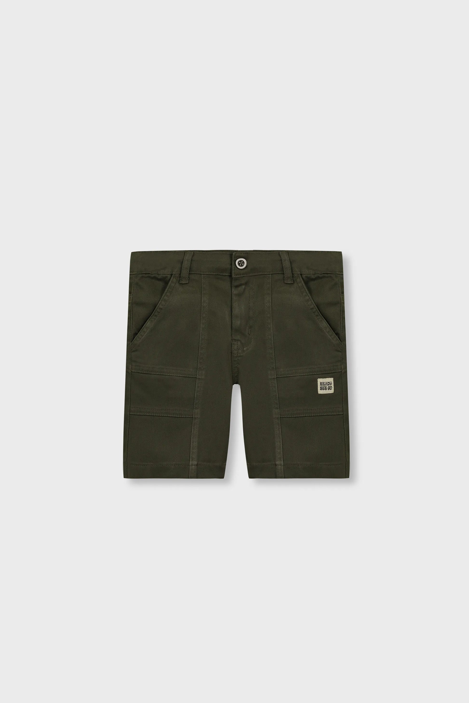 These playful olive twill shorts bring smart structure and easy movement to every day. Designed with cross pockets, matching bartack accents, a stitched fly front, front panel detailing, a canvas patch, and folded hems, this knee length pair gives boys