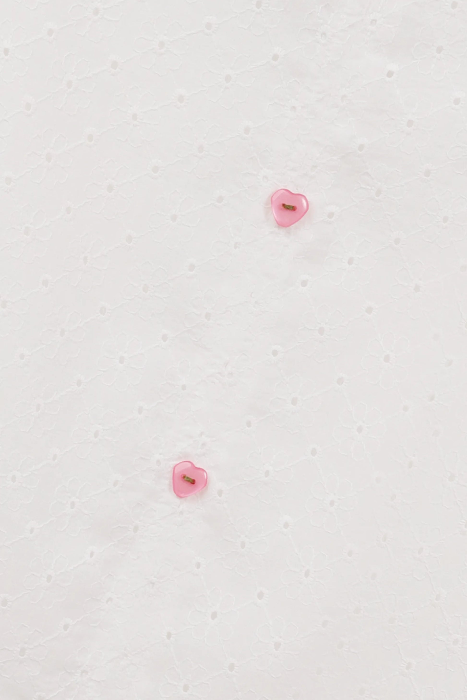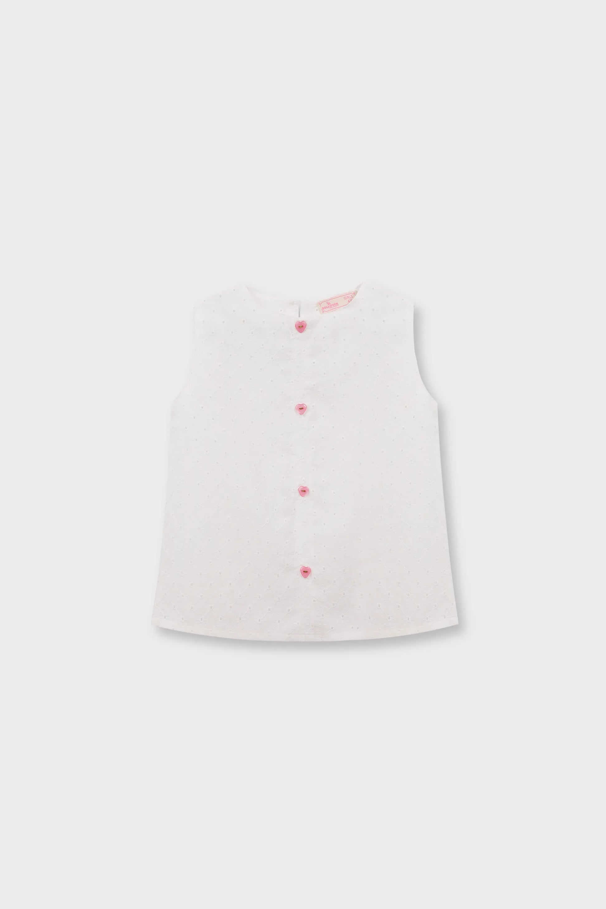 This cute sleeveless white top is made from soft chikan fabric, designed with delicate heart-shaped buttons stitched with yellow thread. The slight round bottom and side slits add an extra touch of style. Perfect for warm days, it’s a playful yet comfy choice for any young girl.