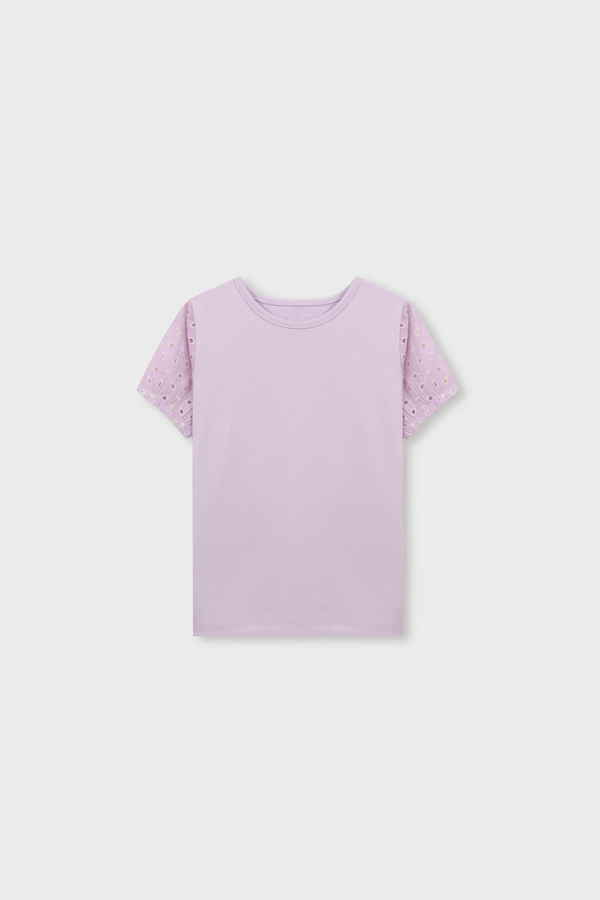 This lilac t-shirt with chic chikankari embroidery on the sleeves offers a stylish blend of contemporary and traditional fashion. Made from soft jersey, it ensures comfort while maintaining a fashionable look. A perfect option for casual wear, it can easily complement both jeans and skirts for effortless styling.