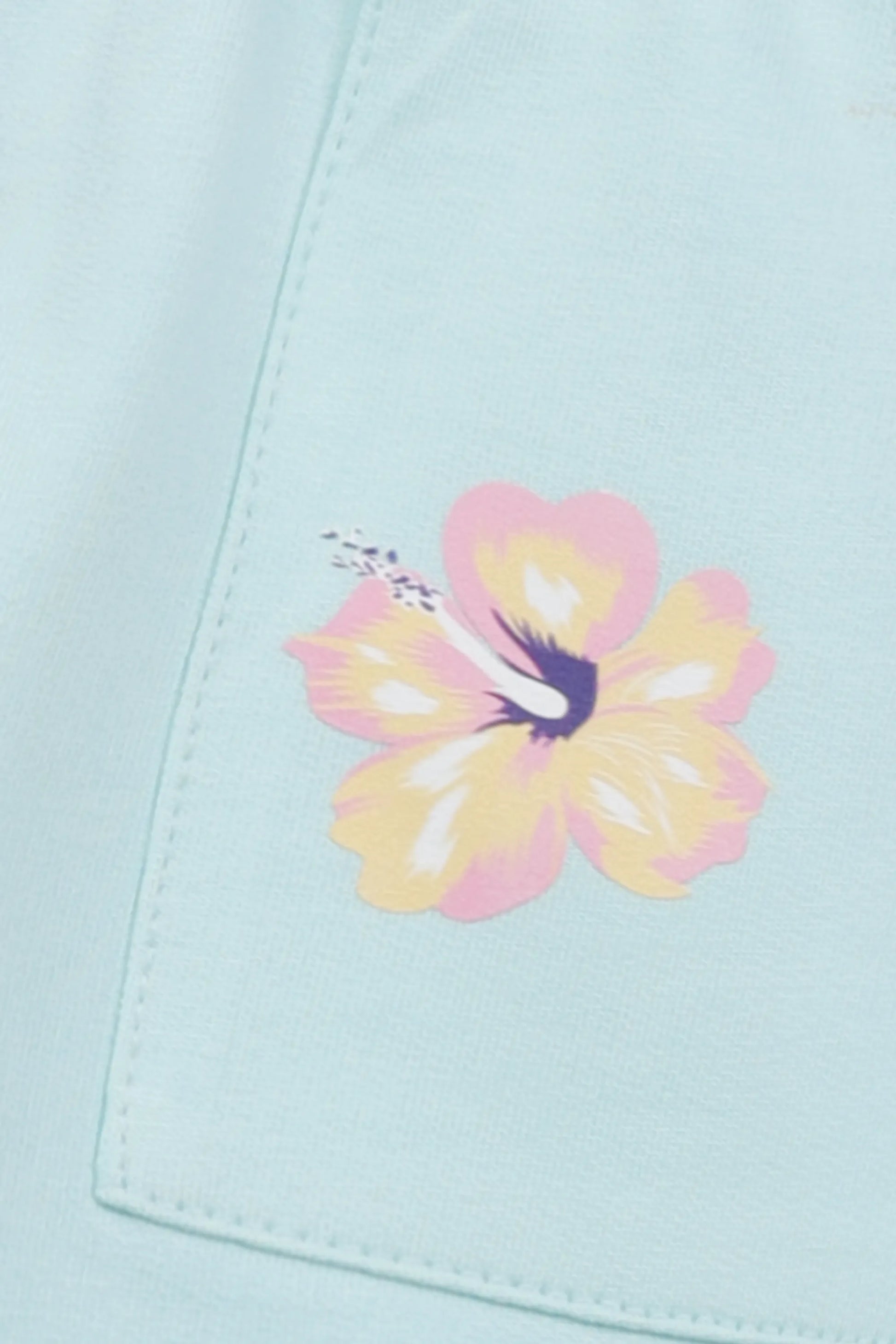 Fresh and cheerful, these light mint shorts bring playful charm to everyday adventures. Crafted from soft French terry, they feature an elasticated waistband with adjustable drawcord for comfort. Patch pockets and a delicate printed motif add sweetness
