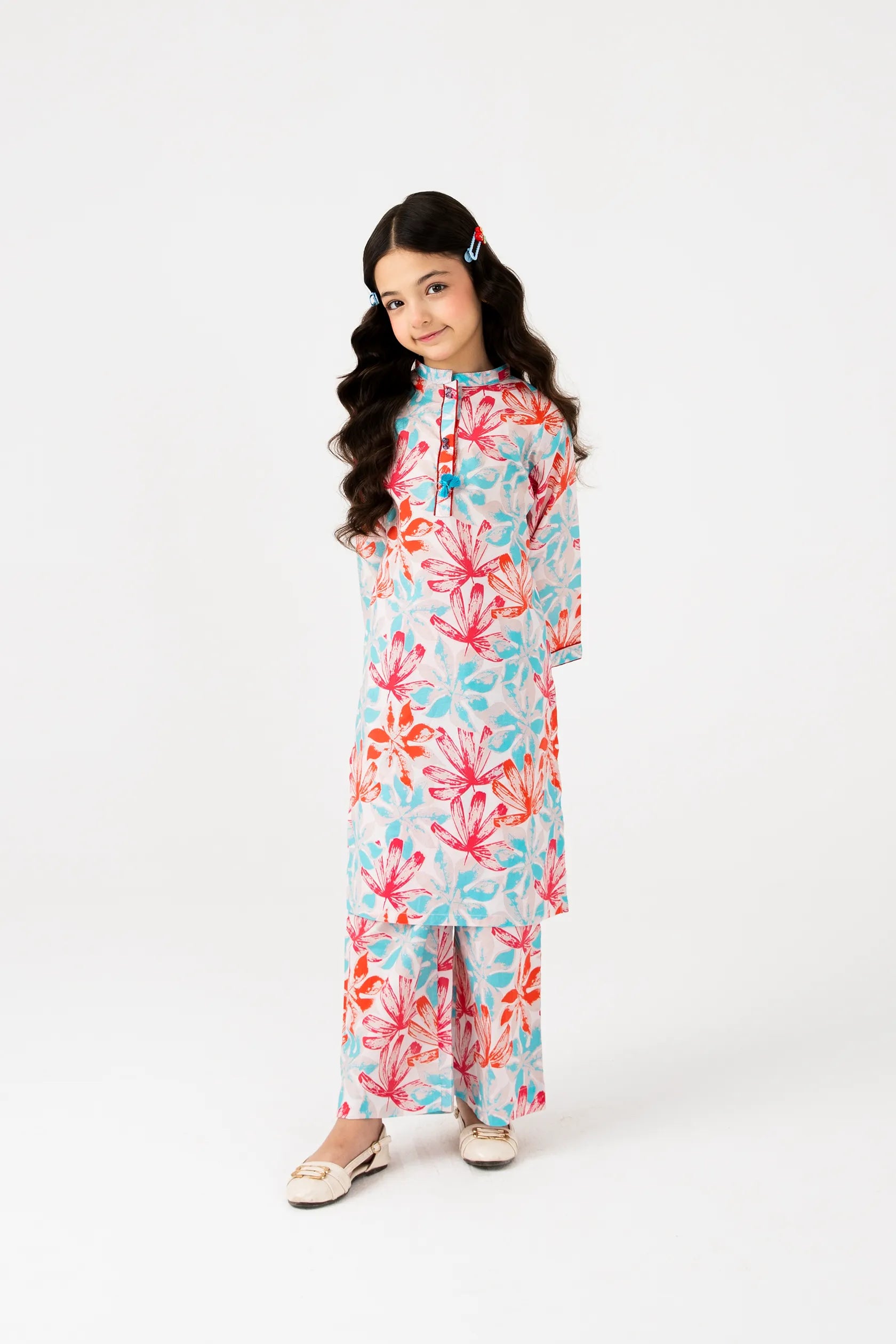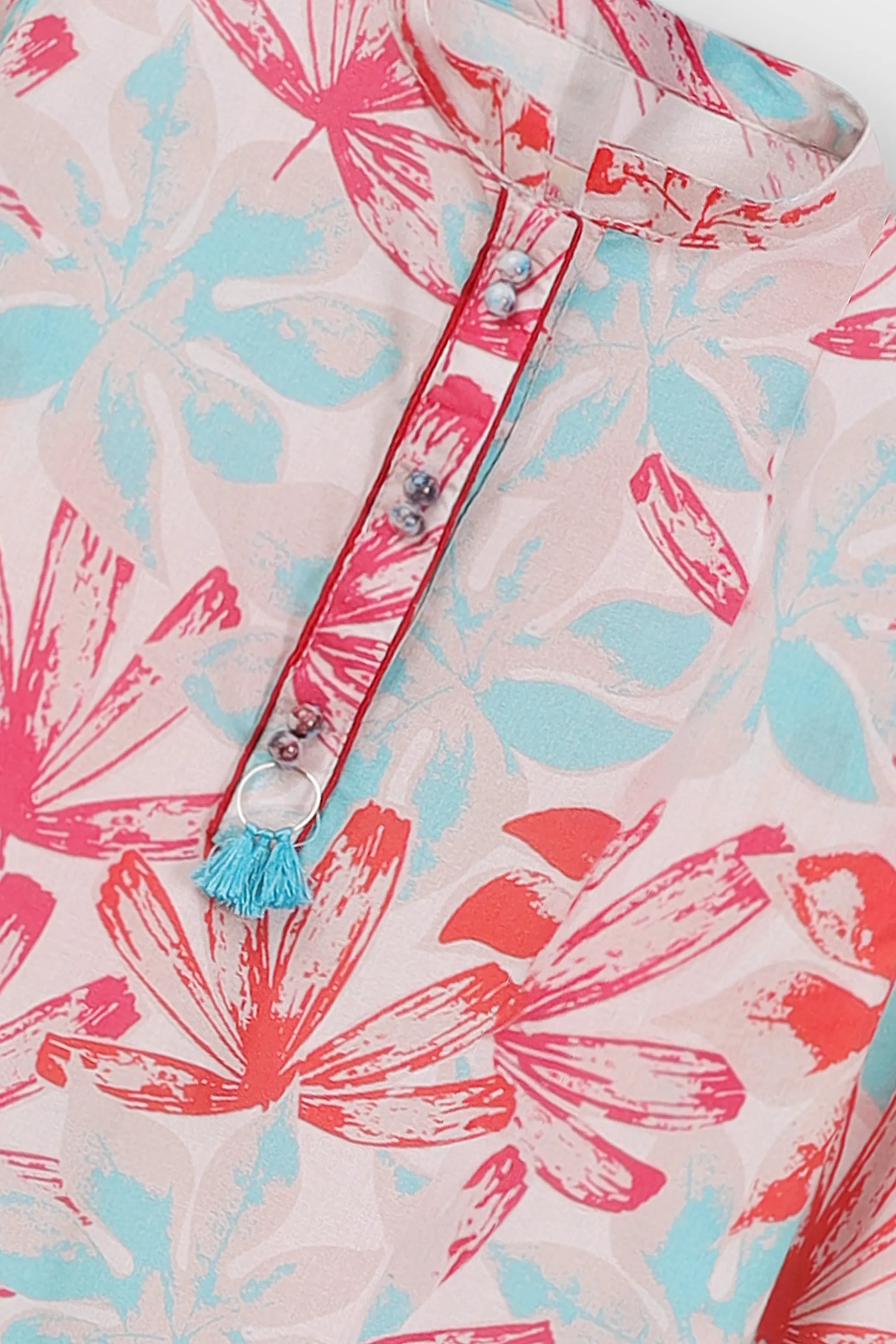 Designed with a playful red, pink and sky floral print, this cotton kurta and trousers set for girls is perfect for every occasion. The full-sleeve kurta features a beautifully crafted placket with delicate pearls, paired with matching straight-fit trousers for a fresh, fun, and stylish outfit.
