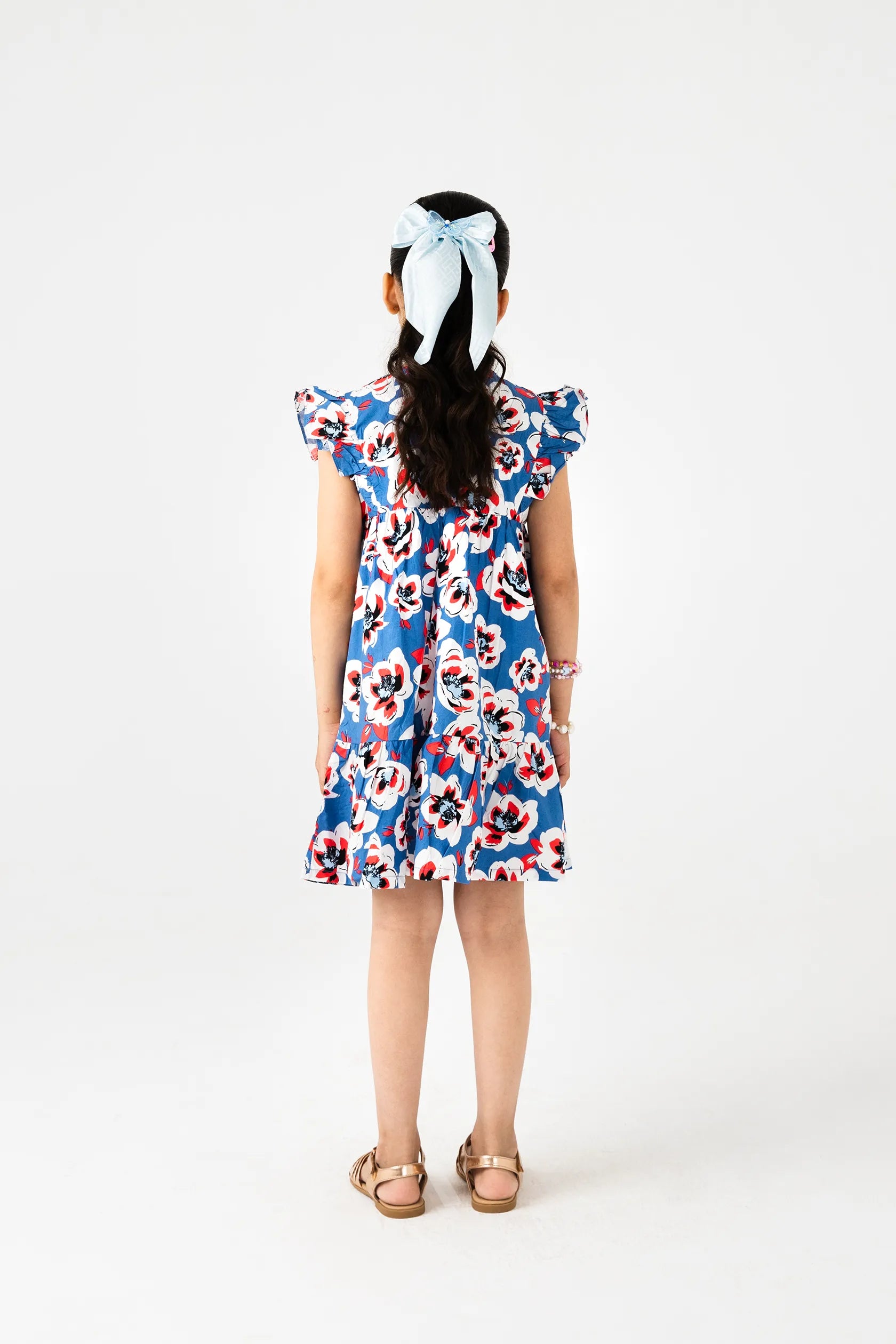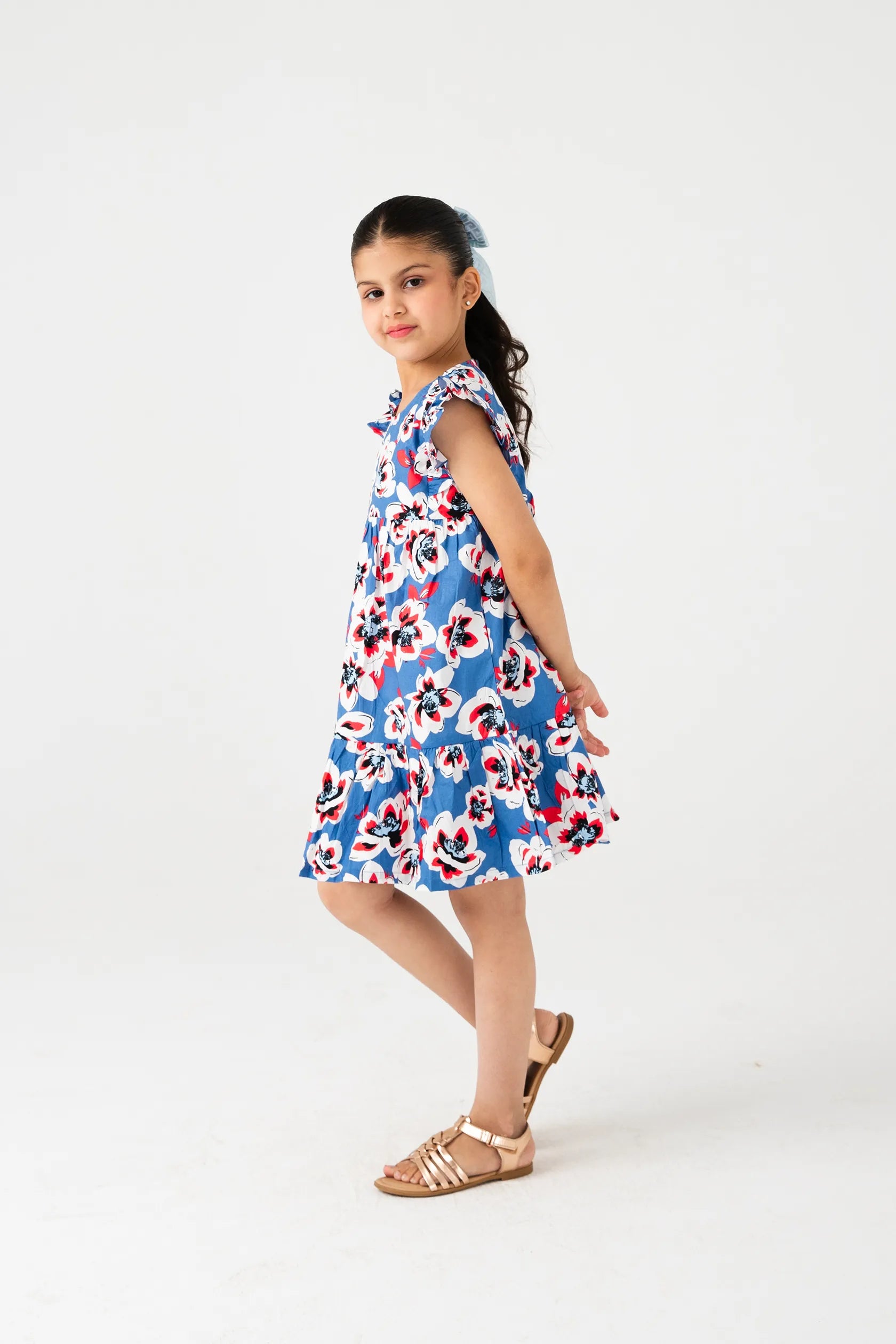 This blue cotton dress features a beautiful floral pattern and delicate frills on the sleeves. The gathered yoke adds a touch of charm, creating a flattering shape for your little one. Perfect for warm days, this playful dress ensures comfort and style with every step.