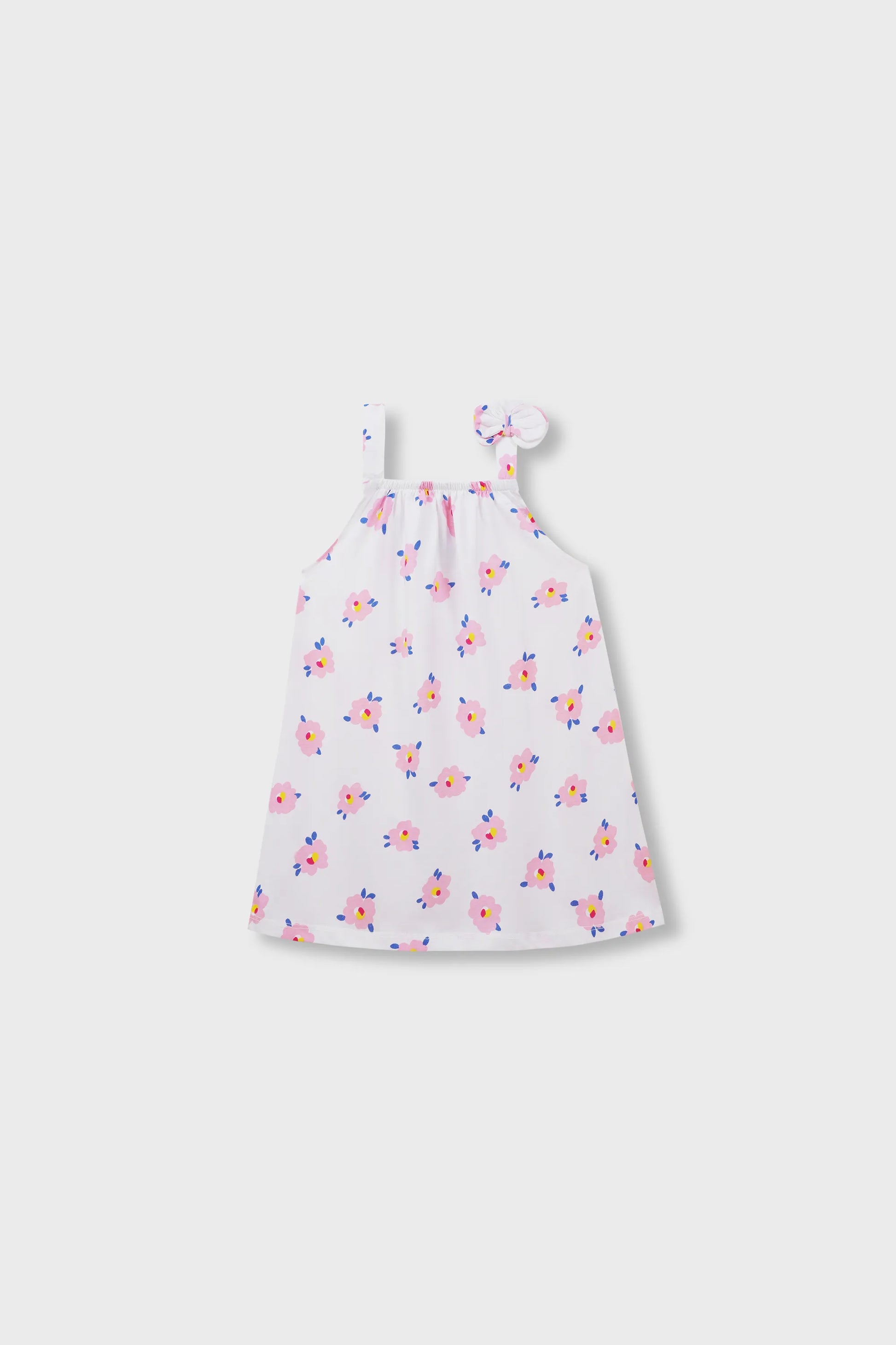 This charming white knit frock is designed with colorful floral prints, perfect for sunny days. Featuring a halter neckline with a bow at the shoulder straps and an elasticated waistband for comfort, this frock is both playful and practical. Ideal for casual outings or fun garden parties.