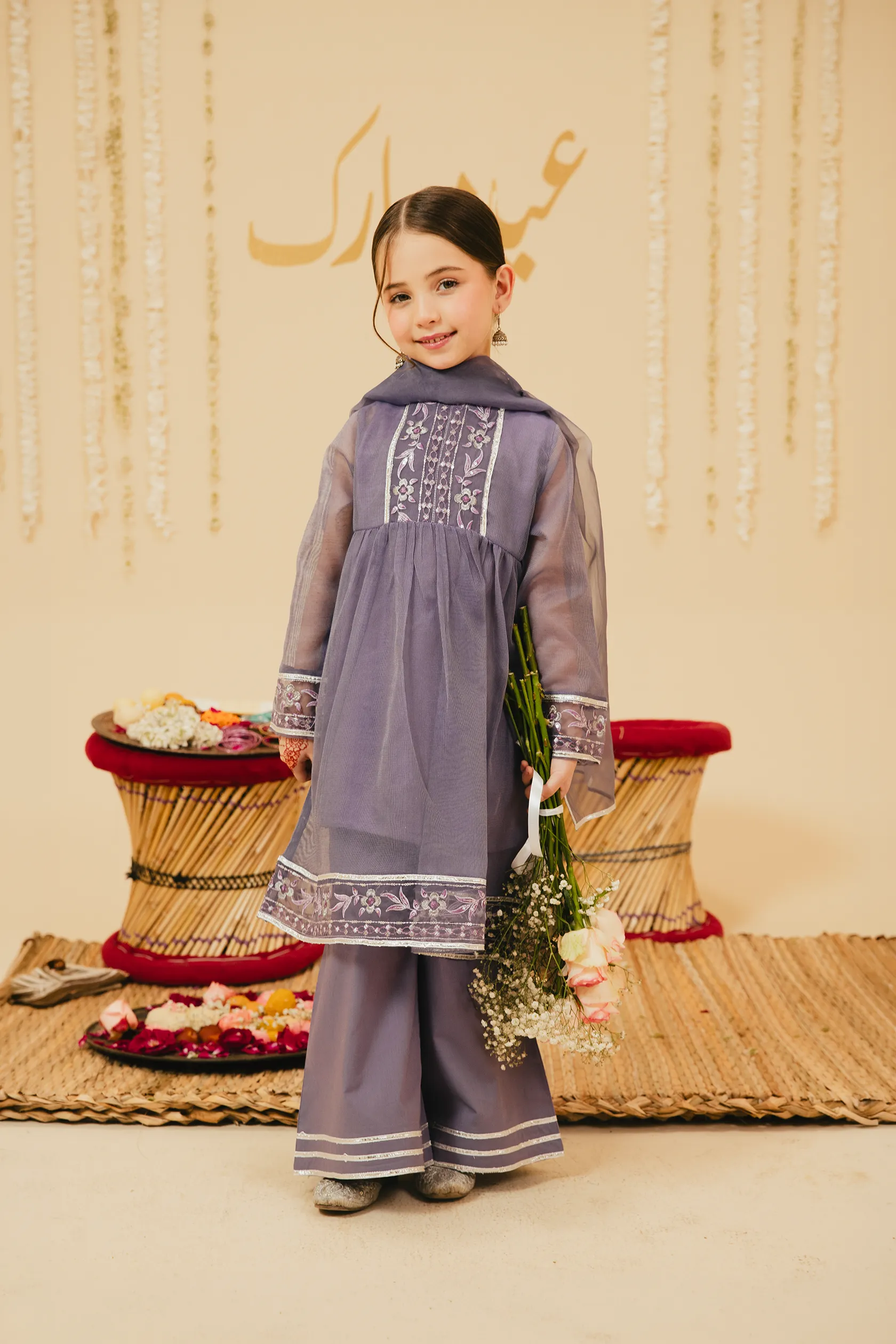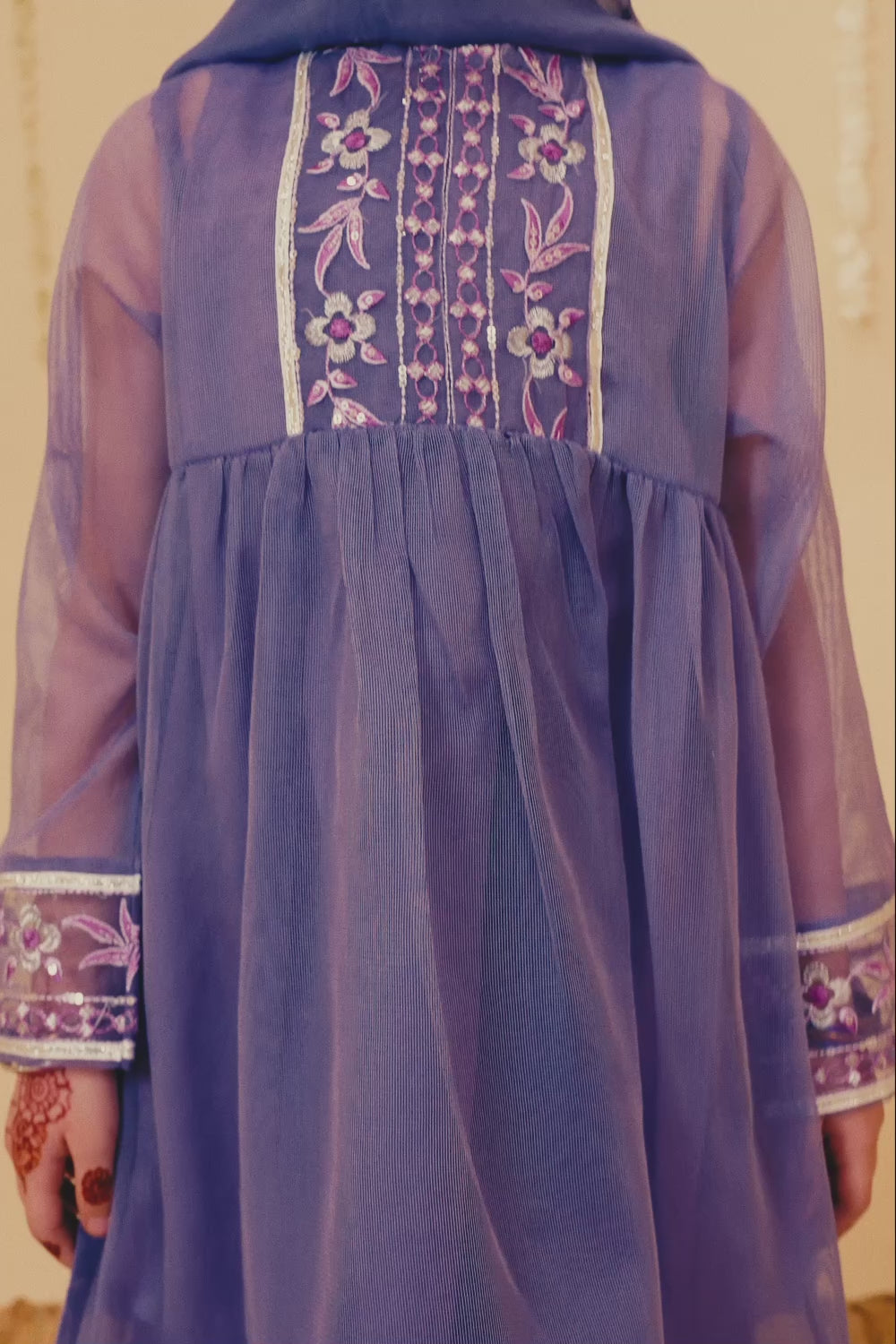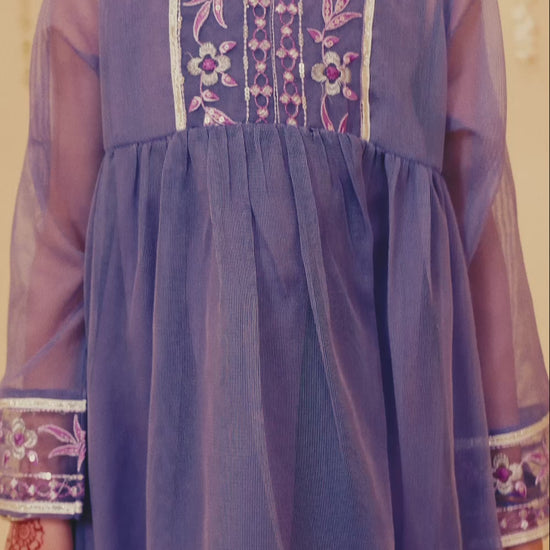 Crafted from self cotton, this royal purple frock set features an embroidered yoke with beads, creating a graceful design. The full-sleeve shirt is paired with a flared trouser and a beautiful organza dupatta. The lappa lines and elegant gathers ensure