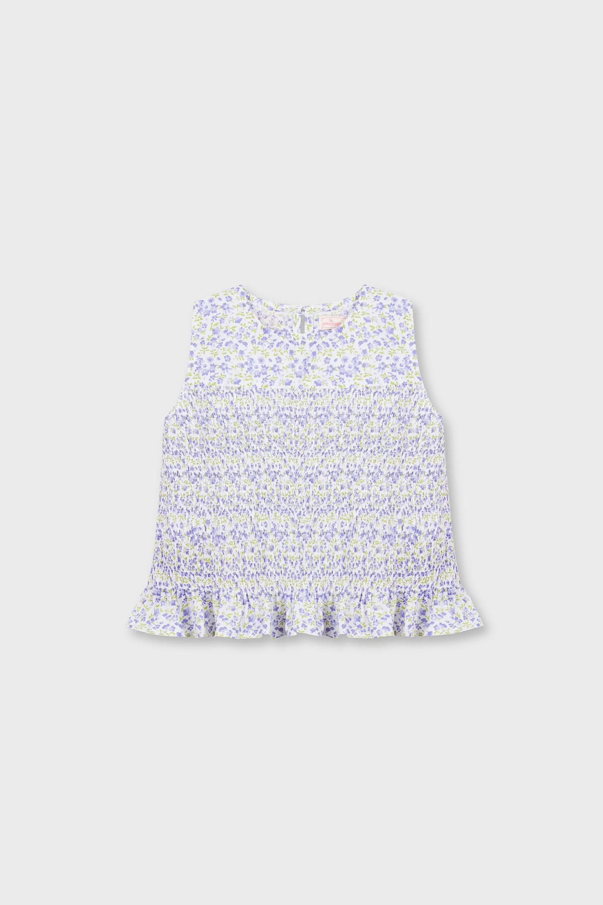 Fresh and full of movement, this purple cotton top brings sweet detail to little wardrobes. The round neck and small yoke create a neat upper shape, while the sleeveless cut keeps it cool. Elastic smocking on the lower panel adds playful volume, comfort, and pretty texture throughout the day beautifully.