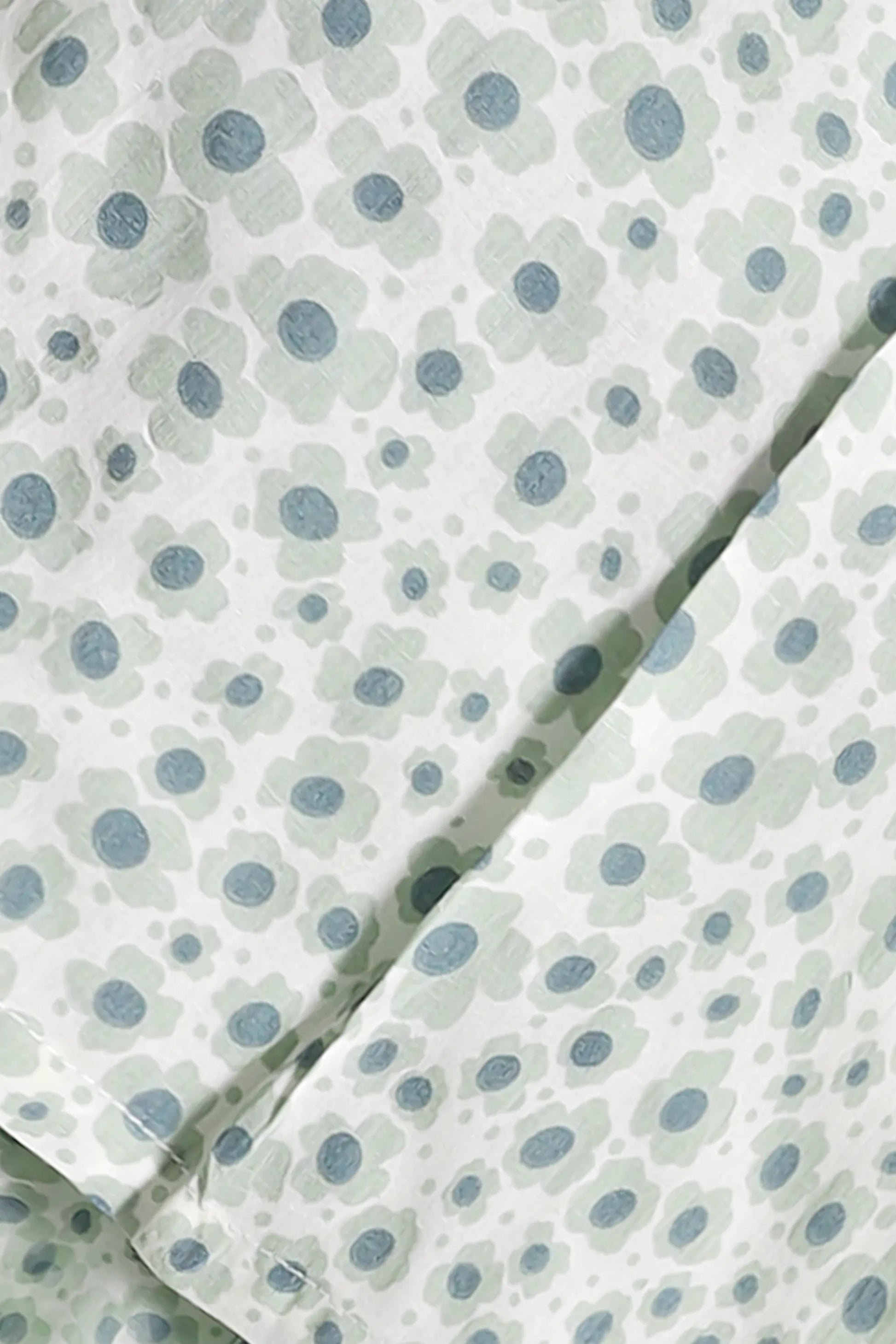 This white cotton top and loose capri set with light green floral print feels fresh, airy, and full of charm. The sleeveless top features a round neckline, two front box pleats, anchor thread cross detailing, and a straight hem. The relaxed capri is finished with box pleats under the belt.
