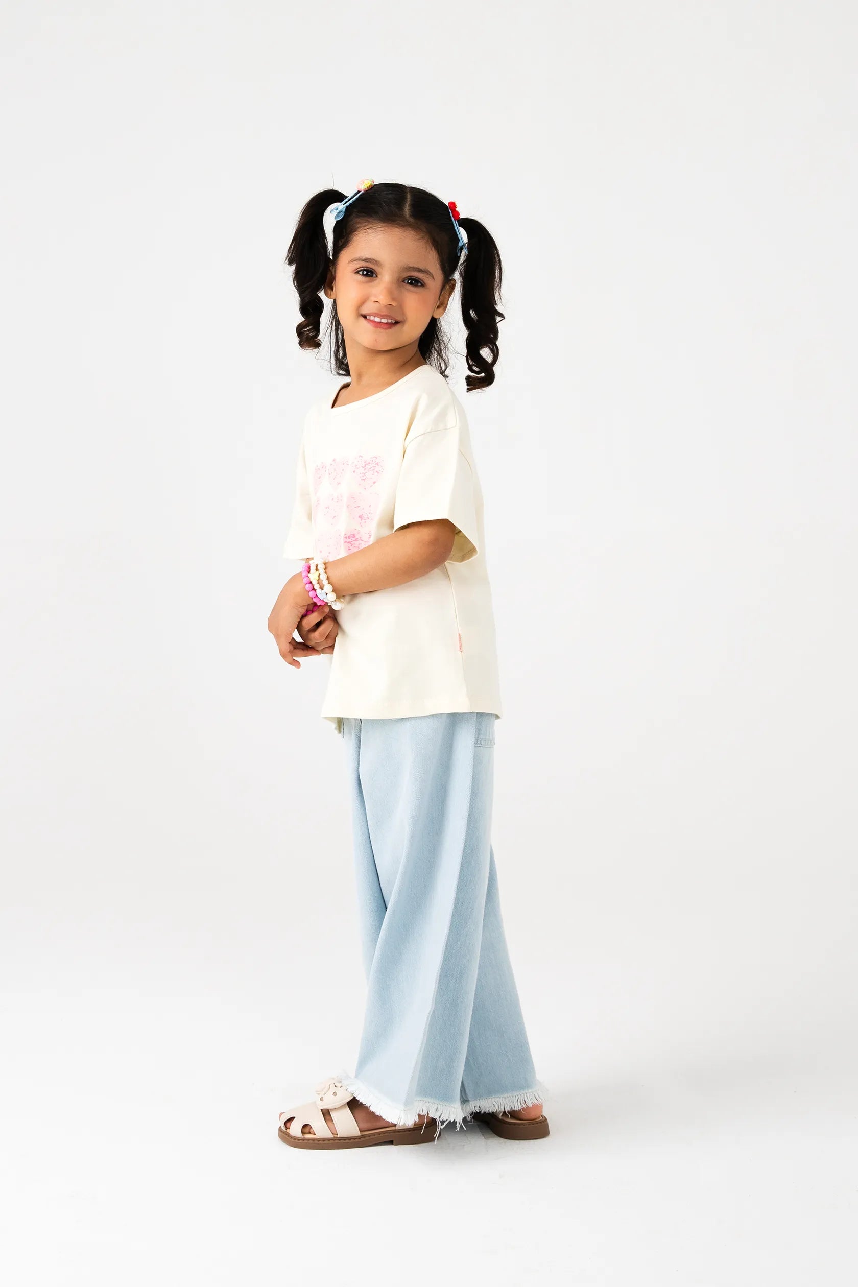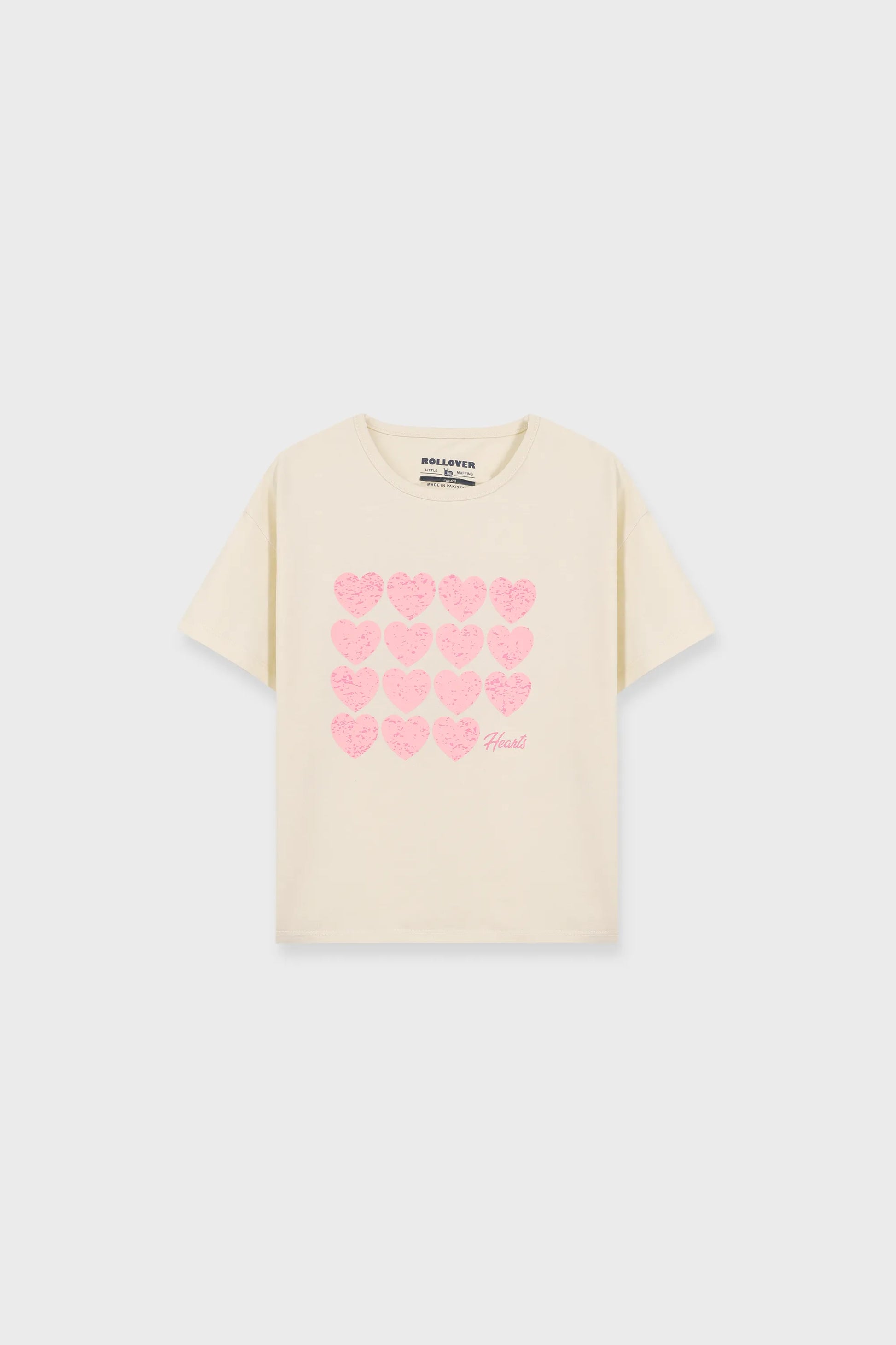 This skin tone jersey t shirt is sprinkled with playful charm through its pink heart graphic across the front. Designed with a self fabric neckline, baby pink tape, relaxed drop shoulders, printed main label, flag label, and clean double needle hems, it is soft, cheerful, and made for everyday twirls.